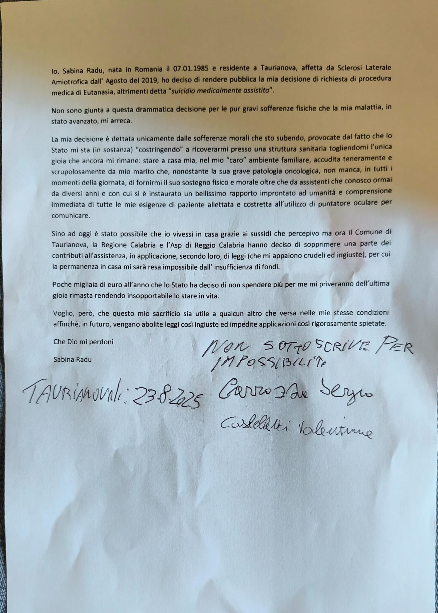 Taurianova, il drammatico caso di Sabina, “Lo Stato mi impedisce di stare a casa mia e ho deciso per l’eutanasia”. L’appello alle istituzioni è di fa cambiare soprattutto idea a Sabina, aiutandola a stare a casa sua con i suoi cari. La lettera integrale