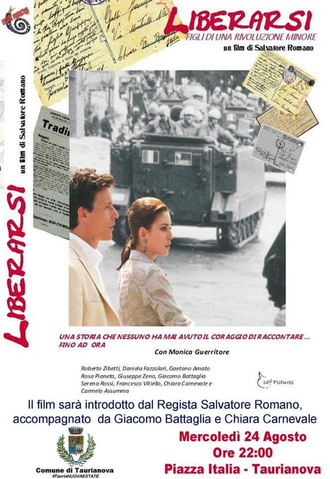 TAURIANOVA – Andrà in scena questa sera, alle 22, in Piazza Italia, nell’ambito della programmazione estiva organizzata dalla Giunta Scionti, la proiezione del film “Liberarsi, figli di una rivoluzione minore”, diretto dal regista taurianovese Salvatore Romano.