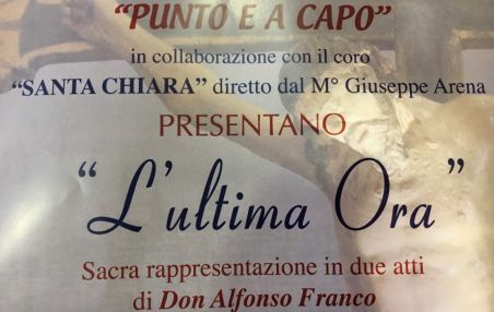 La compagnia teatrale “Punto e a Capo”, in collaborazione con il coro “Santa Chiara” diretto dal maestro Giuseppe Arena, mette in scena “L’ultima Ora”, sacra rappresentazione in due atti di don Alfonso Franco, storico parroco della Chiesa “Santi Apostoli Pietro e Paolo”. L’evento si svolgerà domenica 14 aprile, alle 18.30, nel principale luogo di culto della comunità dell’ex Jatrinoli. Questi i protagonisti che si cimenteranno in un contesto teatrale di argomento religioso, che vede alla regia Tina La Terra, nella settimana che precede le celebrazioni della Pasqua: