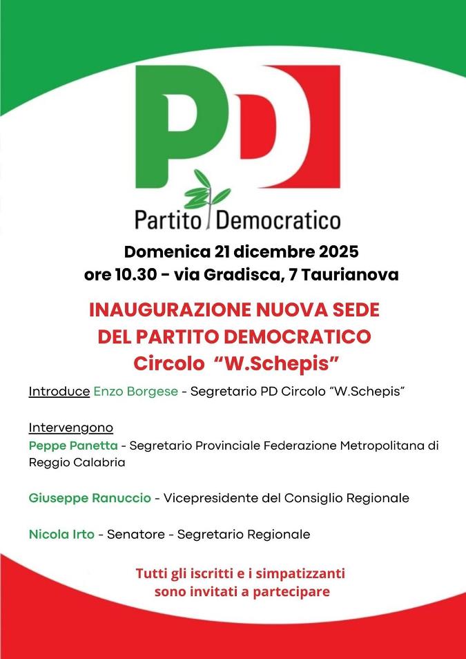 La Federazione metropolitana del Partito Democratico di Reggio Calabria annuncia l’inaugurazione della nuova sede del Pd di Taurianova, in programma domenica 21 dicembre, alle ore 10.30, in via Gradisca 7, a conclusione del congresso del circolo intitolato a “W. Schepis”.