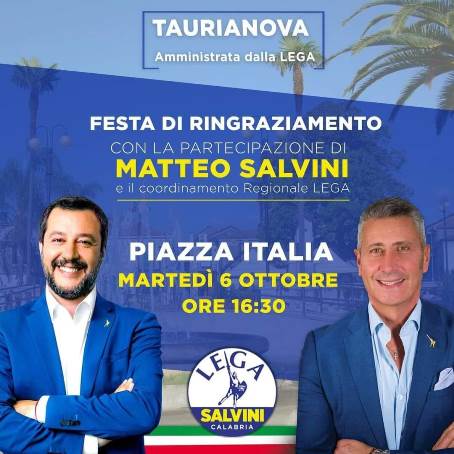 Dopo la vittoria di Roy Biasi come nuovo sindaco di Taurianova, iniziano i festeggiamenti e alle ore 16.30 così come riportato nella pagina social del neo sindaco della città, ci sarà per la “Festa del ringraziamento” nella “Taurianova amministrata dalla Lega”, il leader della Lega Matteo Salvini insieme al coordinamento regionale del Carroccio. Insieme a lui il neo sindaco di Taurianova.