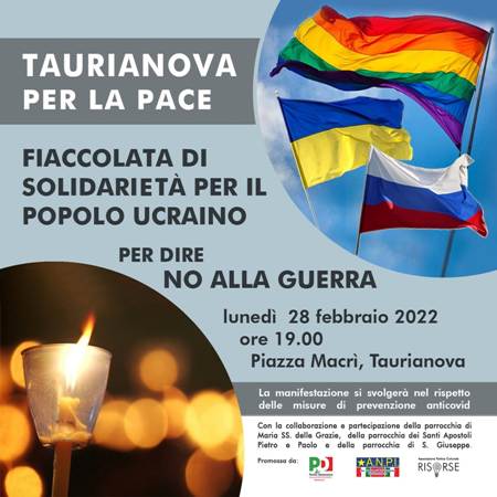 Il Circolo “Walter Schepis” del Partito Democratico di Taurianova, l’associazione ANPI “Bibi Carrozza” e l’associazione Risorse, condannano in modo fermo l’aggressione militare contro l’Ucraina da parte della Federazione Russa ed esprimono vicinanza e cordoglio alle vittime innocenti di questa violenza. Non vogliamo continuare a subire in silenzio i soprusi perpetrati ai danni di un intero popolo, bensì intendiamo partecipare ad ogni iniziativa utile affinché le Istituzioni, italiane ed europee, possano ottenere il ritiro immediato delle truppe russe dal territorio ucraino. In questo momento è necessaria la mobilitazione di tutte le forze politiche e della società civile, senza alcuna bandiera, uniti per la democrazia ed aperti al dialogo, affinché possano riprendere le trattative fra gli Stati nel pieno rispetto della dignità umana, al fine di superare tutte le frammentazioni ed i conflitti. Chiediamo dunque a TUTTE le Istituzioni, le associazioni, le forze politiche, i sindacati ed ogni altra realtà taurianovese, di mobilitarsi per coinvolgere la popolazione a partecipare alla FIACCOLATA che si terrà a Taurianova (partenza p.zza Macrì) Lunedì 28 Febbraio alle ore 19:00. È fondamentale lanciare un segnale forte, un segnale di unità, un segnale di pace.