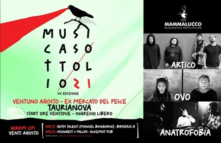 Saliranno sul palco di Musica sottolio il 21 agosto, palco che sarà ufficialmente intitolato a Salvatore Muratore, scomparso a gennaio, amico fraterno di tutti e socio dell’Associazione Multiculturale Mammalucco, gli Anatrofobia, band piemontese pioniera del free jazzcore italico; improvvisazione e contaminazioni elettroniche. Ovo, storico duo noise industrial da esportazione. Musica ancestrale e primitiva nel suo essere avanguardia. Artico, dal nucleo dei Camera 237, un nuovo progetto di musica serrata, emotiva e diretta alle vostre gengive.