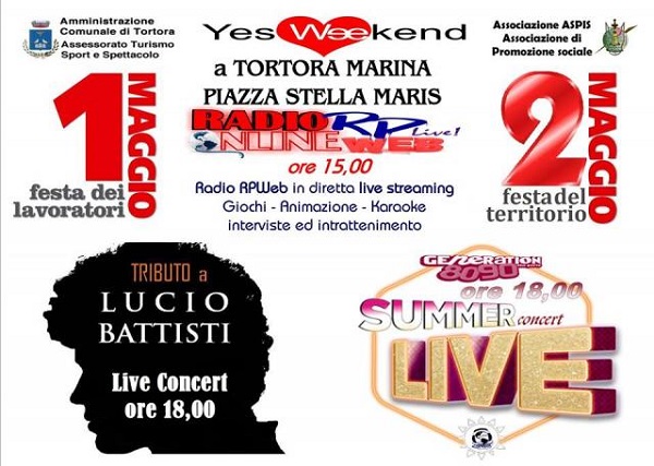 Indetto dall’Amministrazione Comunale di Tortora – Assessorato al Turismo, in collaborazione con l’Associazione di Promozione Sociale ASPIS, per la Festa nazionale dei lavoratori, 1 maggio, a partire dalle ore 15, la piazza è stata animata da una diretta live di Radio RP Web, con musica, intrattenimento e karaoke. Alle ore 18, sempre in Piazza Stella Maris, si è invece tenuto il concerto live “Tributo a Lucio Battisti”.