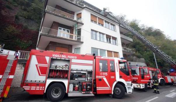 I vigili del fuoco al lavoro per spegnere un incendio scoppiato in un'appartamento a Como, 20 ottobre 2017. Tre dei quattro bambini rimasti coinvolti nell'incendio sono gravissimi. ANSA / MATTEO BAZZI