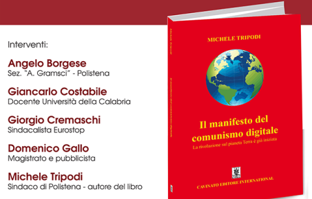 Sabato 30 giugno alle ore 21.30 a Polistena sarà presentato il libro “Il Manifesto del Comunismo digitale”, secondo lavoro editoriale di Michele Tripodi, attualmente Sindaco di Polistena, dopo il primo libro “Lo Giuro sulla Costituzione”, pubblicato nel 2016. L’iniziativa si svolgerà in Piazza della Repubblica alle ore 21.30, e vedrà la partecipazione, oltre che dell’autore, di Angelo Borgese componente sezione “A. Gramsci” ed attuale Presidente del Civico consesso, Giancarlo Costabile professore UNICAL, Giorgio Cremaschi sindacalista Eurostop, Domenico Gallo magistrato e pubblicista. Gli interventi dei relatori si concentreranno sulle tematiche storiche, socio-economiche, informatiche, esposte nel libro fino a spaziare sugli argomenti di attualità politica e giornalistica.