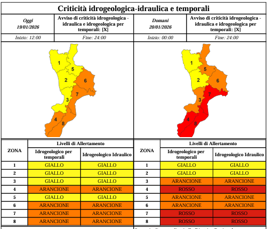 La Protezione Civile calabrese a seguito di alcuni peggioramenti che si stanno verificando in queste ultime ore in merito all’arrivo del Ciclone Harry diramato un nuovo bollettino con allerta Arancione anche nella parte Tirrenica del Reggino e domani si trasformerà in allerta Rossa. Si prevede il persistere di precipitazioni diffuse, anche a carattere di rovescio o temporale, con particolare riferimento ai settori ionici e meridionali delle regioni, con quantitativi cumulati molto elevati. i fenomeni saranno accompagnati da rovesci di forte intensità, frequente attività elettrica e locali grandinate. Si prevedono venti di burrasca dai quadranti orientali, con intensificazione fino a burrasca forte con raffiche di tempesta. Forti mareggiate sulle coste esposte.