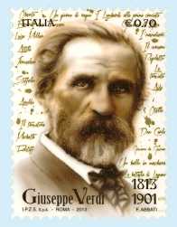 Poste Italiane comunica che il Ministero dello Sviluppo Economico ha autorizzato l’emissione, per il giorno 10 ottobre 2013, di un francobollo commemorativo di Giuseppe Verdi, nel bicentenario della nascita.