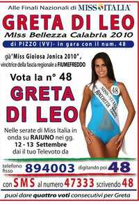 PIZZO – A rappresentare la provincia vibonese al concorso di bellezza più famoso d’Italia, v’è la giovanissima Greta Di Leo. Una bellezza acqua e sapone che certamente non poteva passare inosservata: 1.75 di altezza, castana, sguardo intenso e tanta semplicità a contraddistinguerla. Diciotto anni da poco compiuti ma una maturità al pari di un adulto. Non da meno Greta è impegnata nel sociale: già da parecchi anni, vive quale volontaria, il territorio ed è sempre stata attiva a favore della collettività; del resto è figlia del presidente del comitato provinciale Arcipesca fisa – Protezione civile, Franco Di Leo, dunque, Greta ha sempre vissuto a diretto contatto con il tessuto sociale. Una bellezza statuaria,un viso acqua e sapone e tanta semplicità, questa è Greta. Per lei il concorso di bellezza è stato soltanto un gioco, un voler provare e vivere quell’esperienza nella totale spensieratezza. Ha altri obiettivi, del resto, nella vita: prioritario il diploma (è studentessa presso il liceo linguistico del capoluogo) e, subito dopo, il suo desiderio più grande è entrare all’accademia militare, poichè la Marina militare l’ha sempre affascinata. A sostenerla anche mamma Daniela, la quale l’ha sempre affiancata nelle numerose trasferte calabresi, nelle quali ha ottenuto la fascia di miss Gioiosa Ionica e miss Rocchetta, ed i due fratelli, Bruno e Federico. Per la città di Pizzo è un momento importante poichè potrebbe vedere il suo nome veicolato a più non posso ed essere ricordata, non soltanto per il re Gioacchino Murat, nè per il famoso tartufo e nè per il tonno, ma a fare da Caronte, questa volta vi sarà la bellezza pura di Greta. Per sostenerla, i prossimi 12 e 13 settembre, nelle serate in cui andrà in onda la trasmissione “Miss Italia” su Raiuno, componete il numero di telefono fisso 894003 e digitate il n.48 (oppure tramite sms al numero 47333, scrivete sempre il numero 48.)