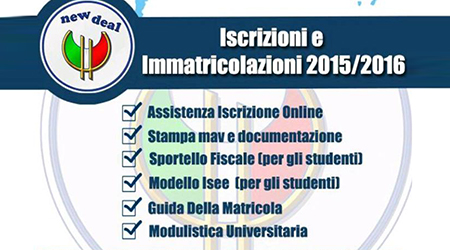 Il nuovo anno accademico è alle porte e l’Associazione universitaria New Deal si rimette subito a lavoro per gli studenti con tutto il suo staff studentesco continuando ad offrire, come ogni anno, un completo servizio di assistenza per immatricolazioni e iscrizioni all’anno 2015/2016, del tutto gratuitamente – in aggiunta al consolidato supporto istituzionale fornito dall’info point dell’Università Mediterranea.